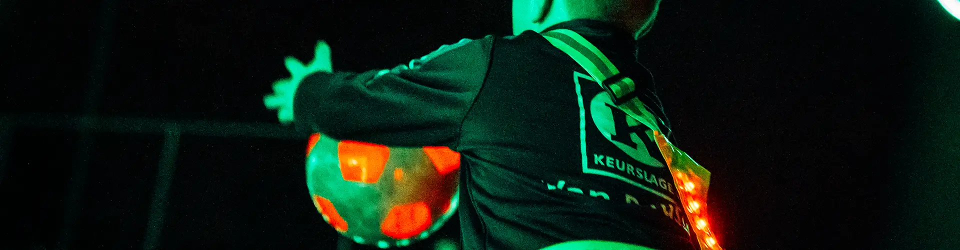 Nee, het is wel bijna pikkedonker. Met LED-voetbal is er een béétje verlichting, hele vette verlichting zelfs. Fluorescerende ballen, lijnen, doelen en spelers: ze zorgen voor een ongekende sfeer op het veld. Je weet in eerste instantie niét wat je meemaakt: waar moet je kijken? Hoe staat de tegenstander? Waar is de bal? Het is fantastisch om mee te maken en te zien hoe de spelers op intuïtie reageren.